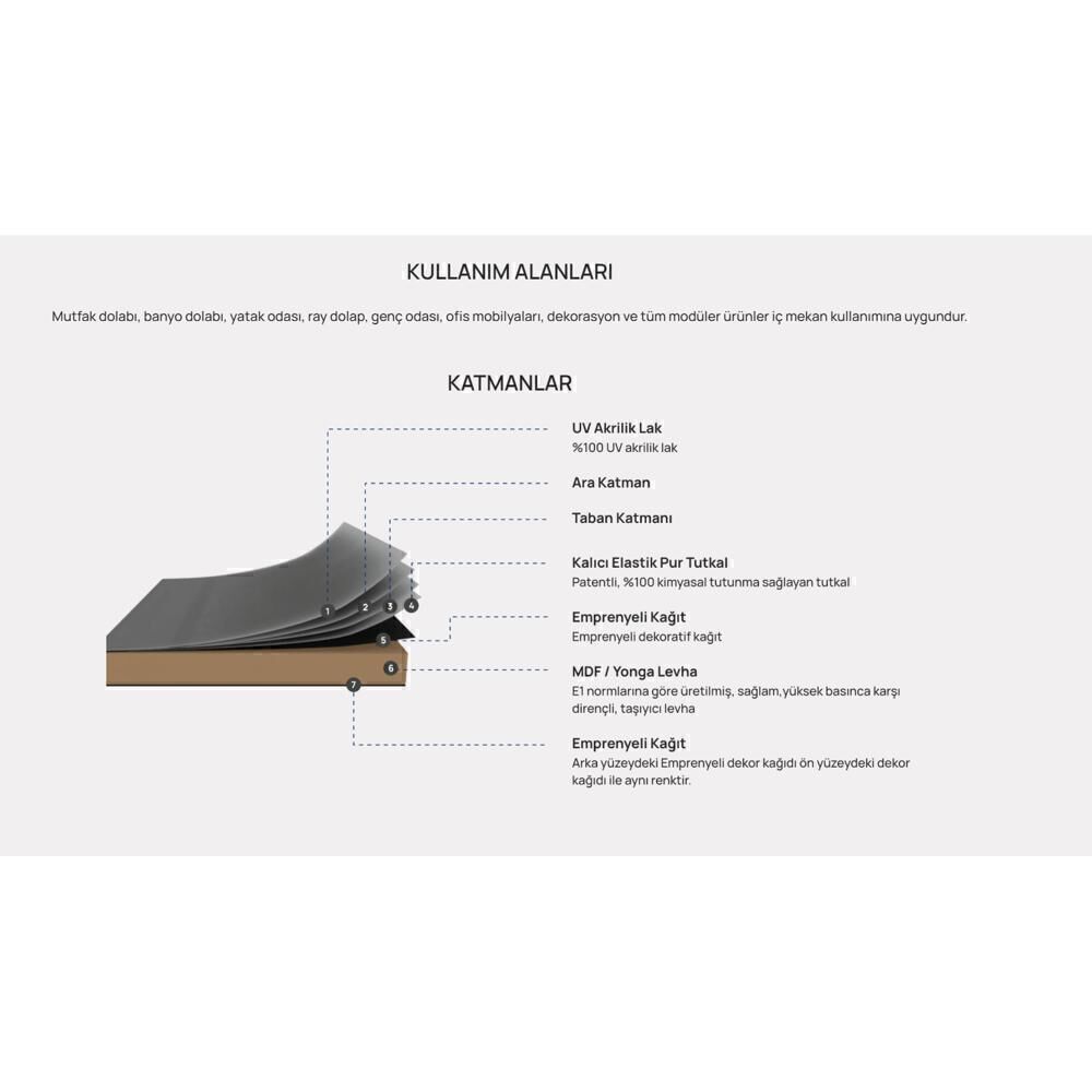 Mutfak dolapları, banyo dolapları, vestiyer, gardırop ve TV üniteleri gibi birçok alanda kullanılan D161 Dafne Glossmax, parlak yüzeyi ile bulunduğu ortama aydınlık ve derinlik hissi katar.